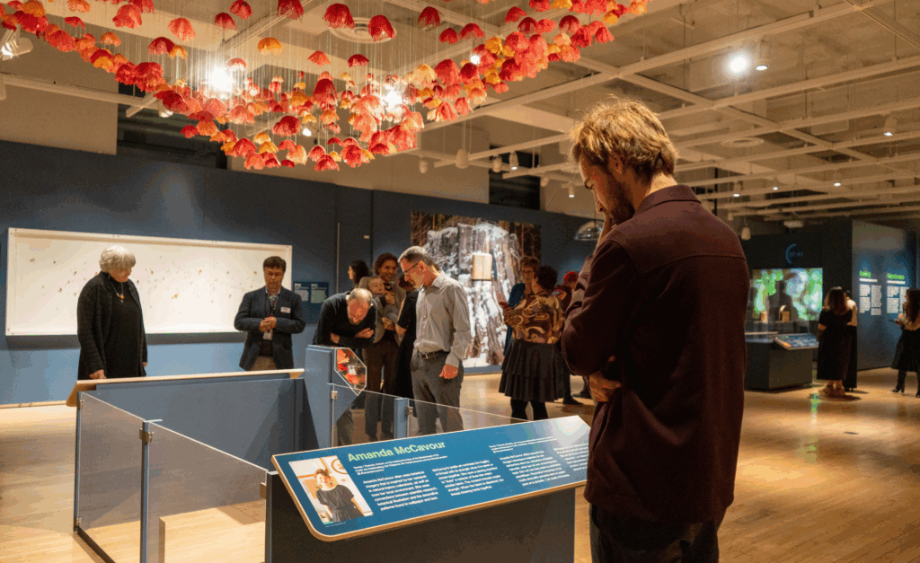 Walking through the museum, you arrive at Amanda McCavour’s embroidered garden of 500 poppies suspended above, fragile yet immersive, transforming the gallery into a rewilded ecosystem of thread and brilliant colour. Natasha Lavdovsky’s moss and lichen–inspired work blurs the line between art and science, inviting us to see rewilding as a partnership with often overlooked organisms that stitch ecosystems together. Amber Sandy’s birchbark and hide works honour Indigenous knowledge and relationships with the land, rewilding cultural connections alongside ecological ones.