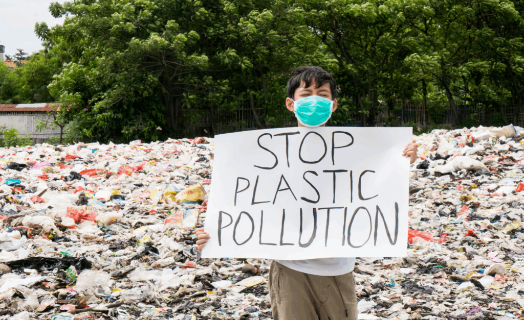 A young person standing amongst plastic waste in Indonesia. Plastic pollution is a major threat to human and planetary health.